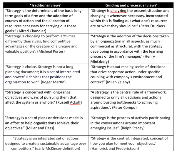 It would seem reasonable that the starting point should be some shared understanding of what strategy is. I can say with a certain degree of confidence that it is NOT planning, budgeting, objectives, first mover advantage, mission, vision etc. Some of these maybe elements of strategy but they are not strategy. Strategy is the how, it is action, and it is doing.