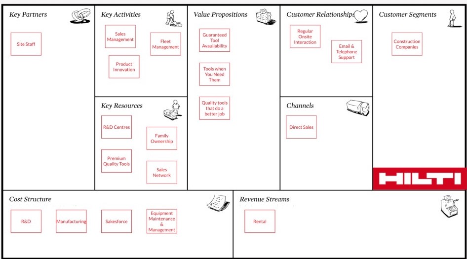 Hilti (a power tools manufacturer) is a classic example of a transactionally based B2B seller who recognised the need to shift in light of changing market conditions and competitive pressures. You can see in the above canvas the key elements of the BMI for Hilti:
