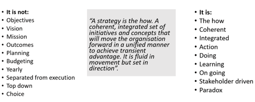 Too many so called strategies or strategy statements are ill conceived positioning statements that describe, to some degree, the ‘what’. This is a view deeply rooted in a school of strategy that relies heavily on analytical techniques and little on learning or emergence. There is almost no description of the how. It could be argued that strategy is the how and I have argued that elsewhere.