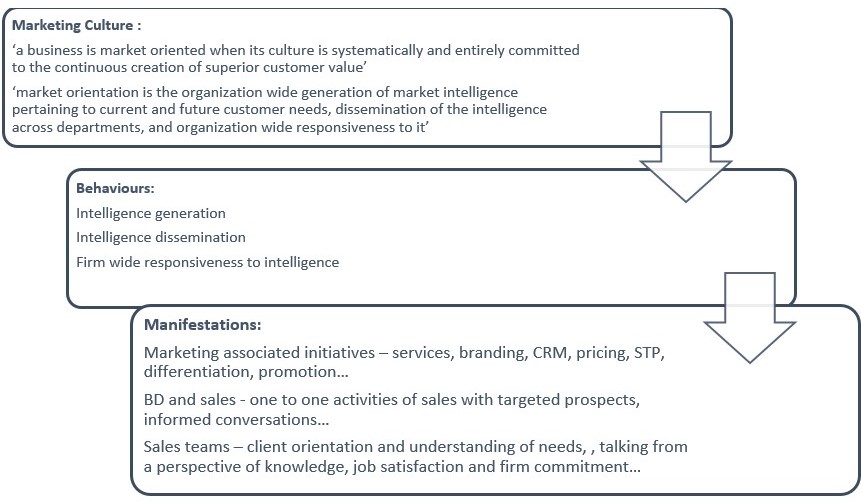 The above figure shows the explicit link between marketing (as strategy, in other words the orientation and culture of the firm), firm behaviours, and the link to the manifestations of marketing, BD, and the areas of sales team work that it affects. What this figure details is that aside from technical advice, customers demand an increasing amount of business advice and industry knowledge that is linked to the technical advice sales people provide. For a professional (and firm) to effectively differentiate themselves in the eyes of the customer, they must be able to deliver a level of value (whether through industry and technical know how, responsiveness, pro-activity etc) to customers that is different from what other providers can offer. Additionally, since a marketing culture is associated with job satisfaction and engagement, it acts as a motivator for sales people to engage in individual level market oriented behaviours which are aligned with the needs of customers. In this sense, marketing in its truest form becomes a key pillar in the work of sales teams and what they deliver to customers.